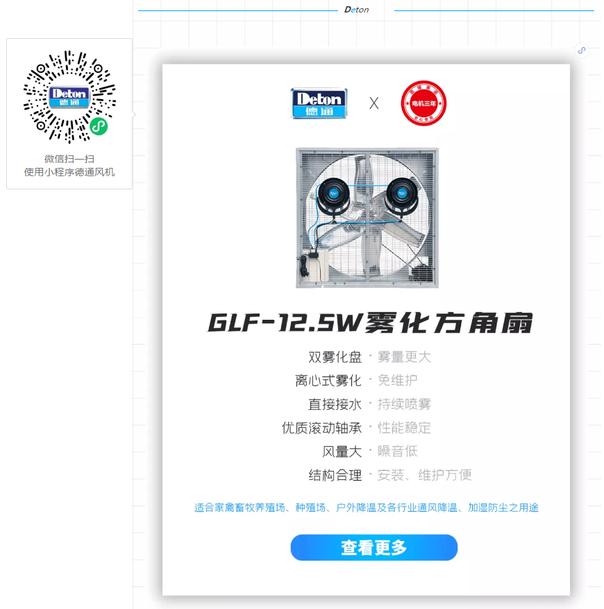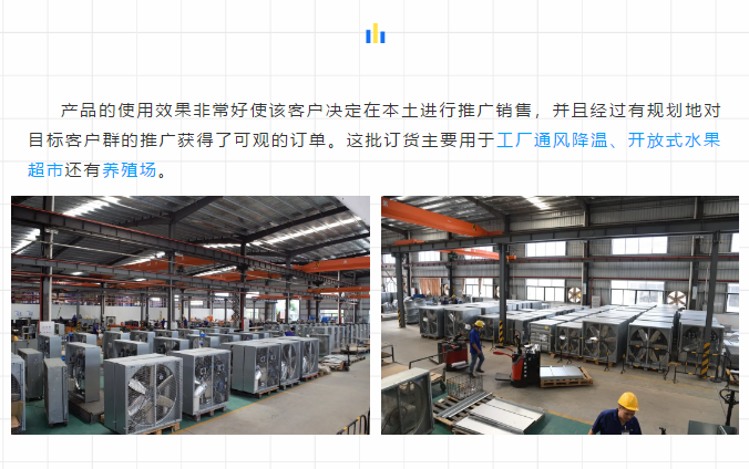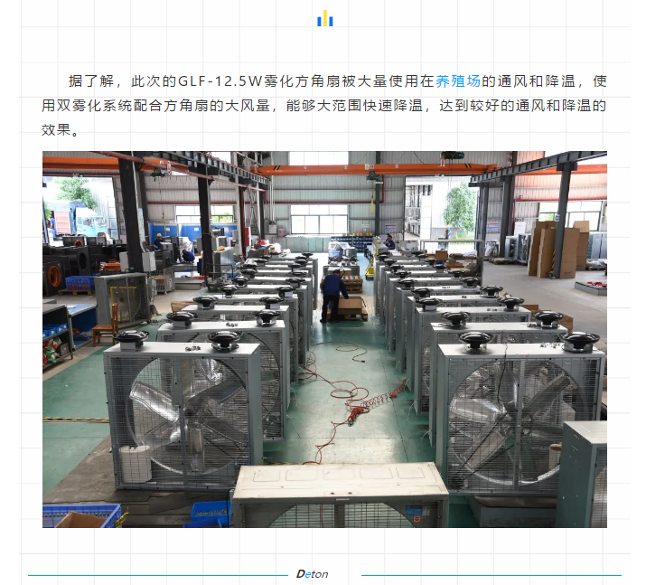 海外市場部的同事介紹,該客戶近年在德通的推薦下零散訂購了一些GLF豪華方角扇和GLF霧化方角扇用于自己的倉庫和車間通風降溫。