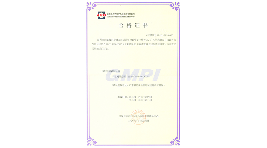 廣東肇慶德通有限公司實驗室持續(xù)符合GB/T1236-2000《工業(yè)通風(fēng)機 用標(biāo)準(zhǔn)化風(fēng)道進行性能試驗》的標(biāo)準(zhǔn)規(guī)定的性能試驗要求,續(xù)頒合格證書!...